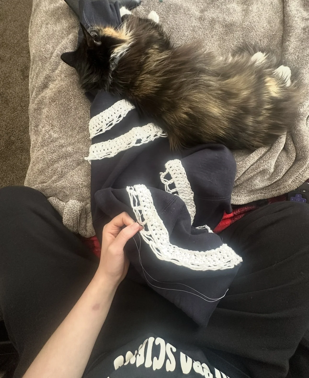 Each piece is designed and handmade by me with the help of my overseer, Penney the cat. Together we create one of a kind clothing pieces that make you a walking piece of art.